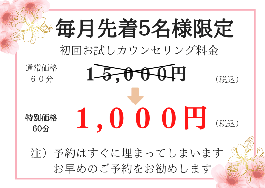 毎月先着5名様まで15,000万円の相談料が1,000円になります。