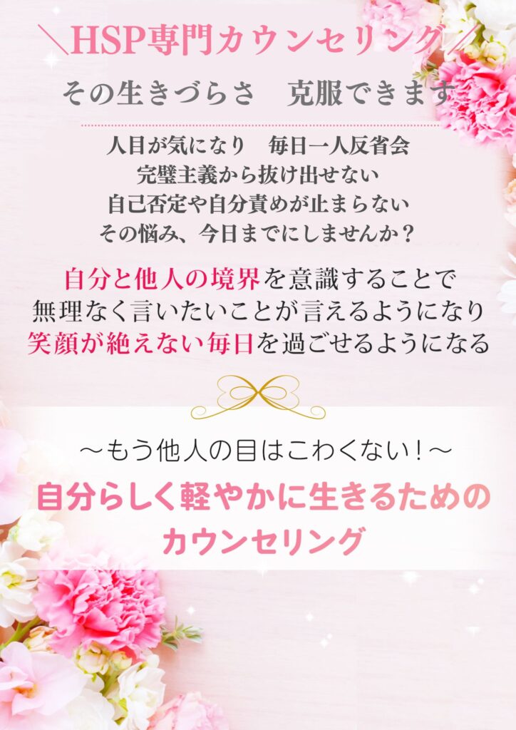 相手の表情を読んでしまい、自己肯定感が下がりがちなHSPさん。丸ごと自分を受け入れて、自己肯定感を高めます。自分を大事に出来るようになると、相手の事も自然に大事に出来るようになり、相手からもより大切に扱われるようになります。